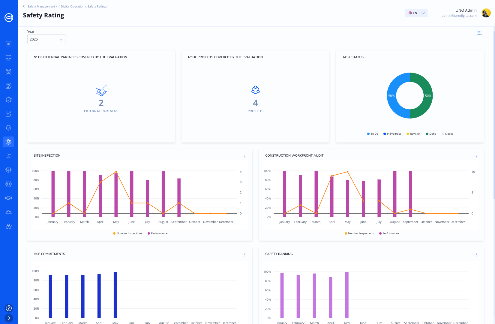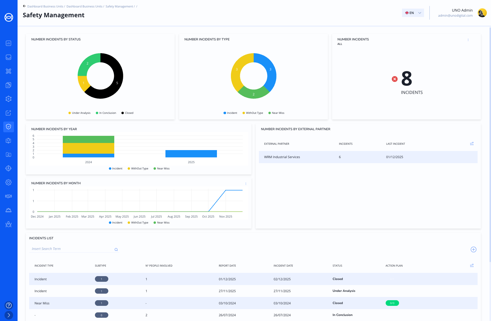 The UNO Safety and Risk Management Platform simplifies complexity and puts you in control. Replace spreadsheets with a centralised system that manages compliance and provides real-time risk assessments. The system also manages incident and near-miss reporting, investigations, and the identification of lessons learned. Proactive alerts, GDPR-compliant access and analytics enable your organisation to predict, prevent and mitigate risks. Scalable and mobile, UNO enables data-driven decisions anytime, anywhere.
